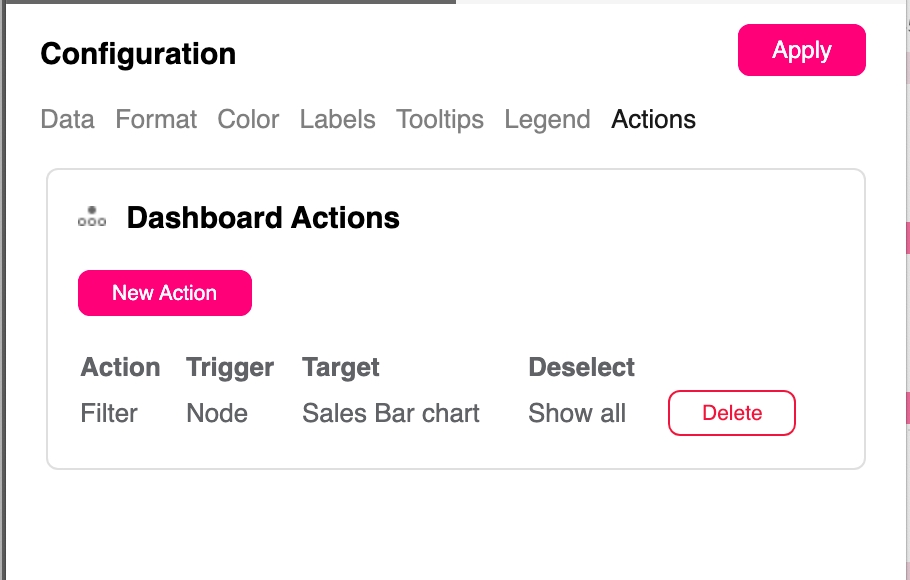 Dashboard actions can be configured from the "Actions" tab in the configuration pane. Click on the "New Action" button to create new dashboard action.