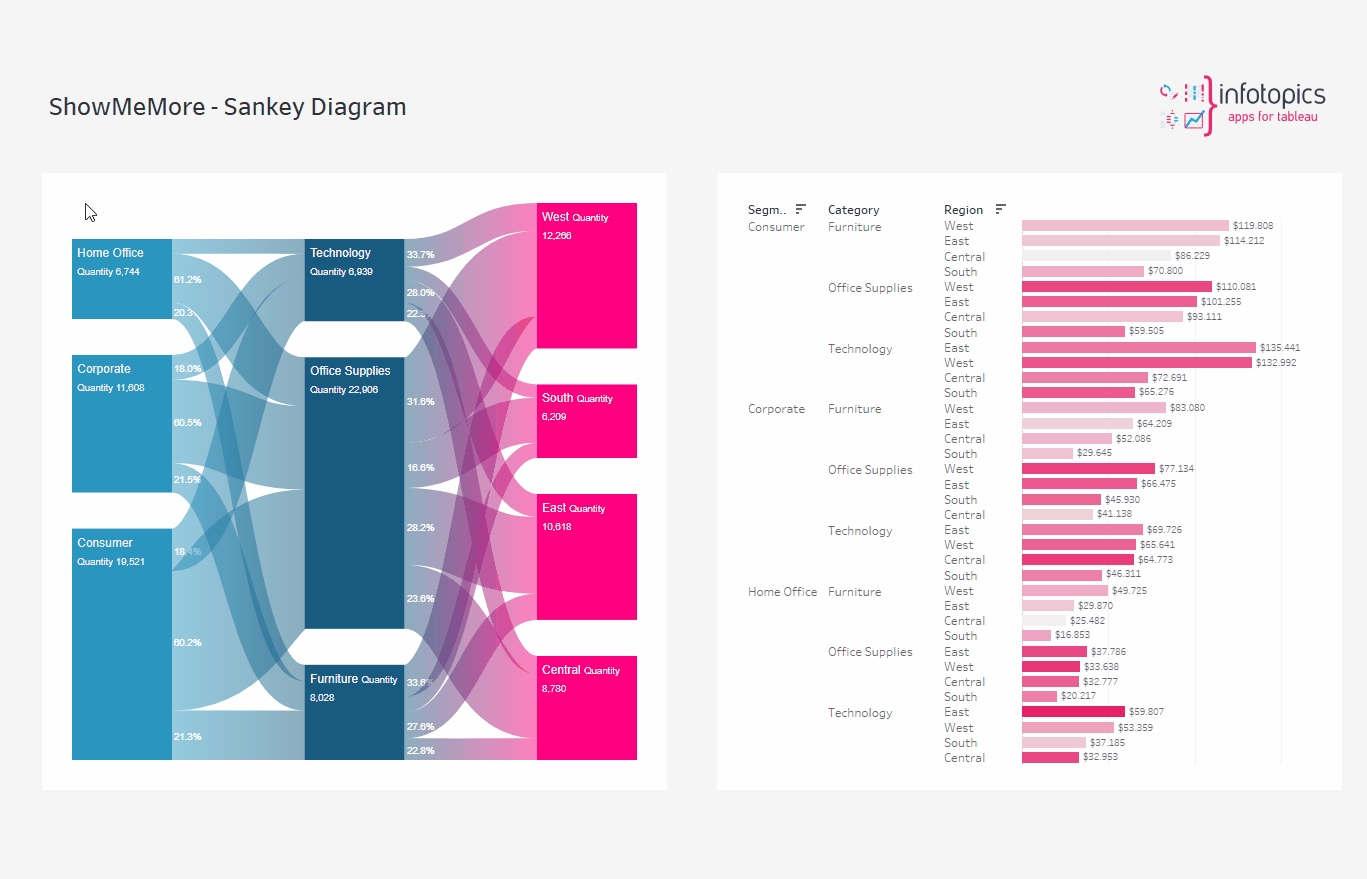Set up your dashboard action using a filter or a parameter from the dropdown menu. With the filter option you can trigger a dashboard action that filters on other sheets in your dashboard. A parameter action will change the value of a parameter to the node or link you selected in the Sankey. Very powerful features to control interactivity and usability!