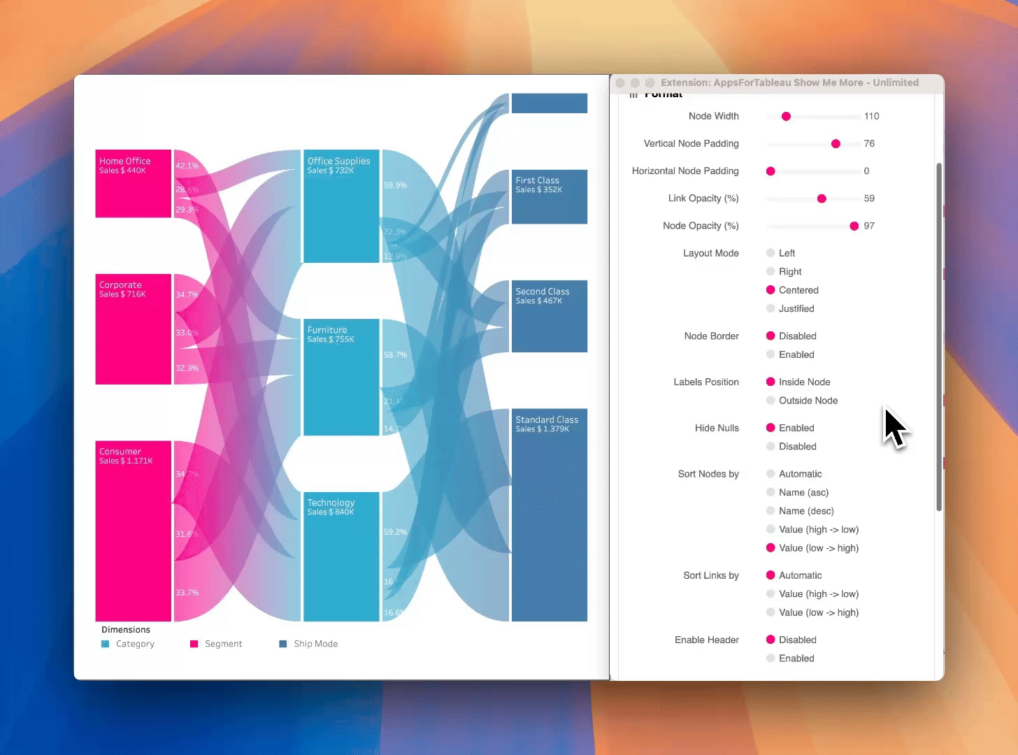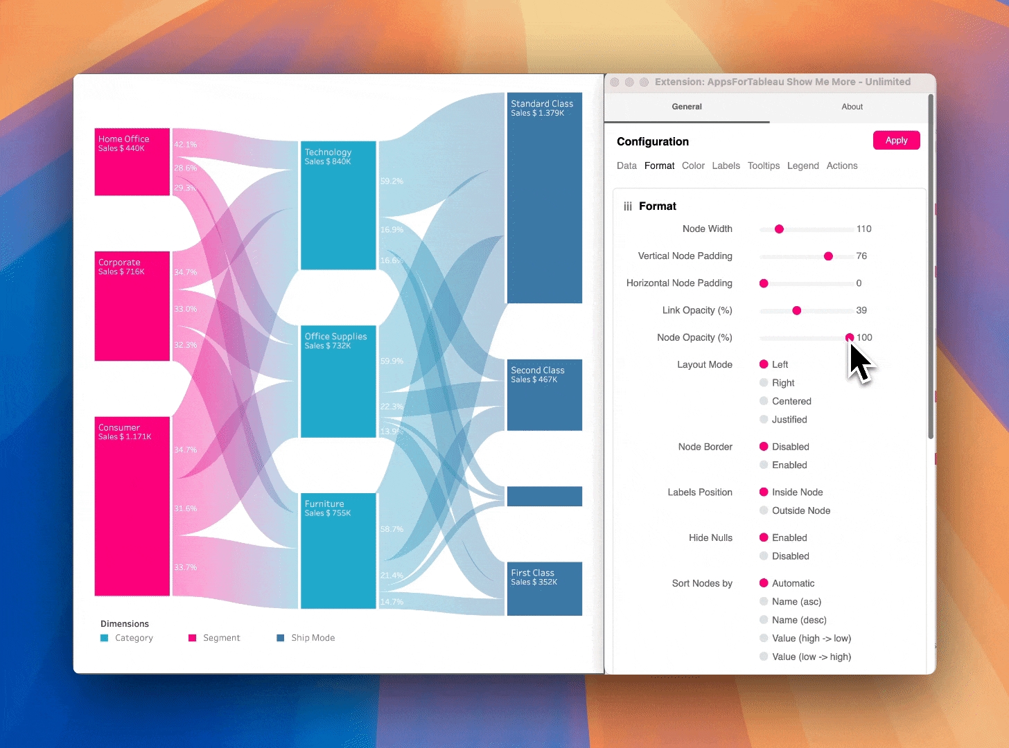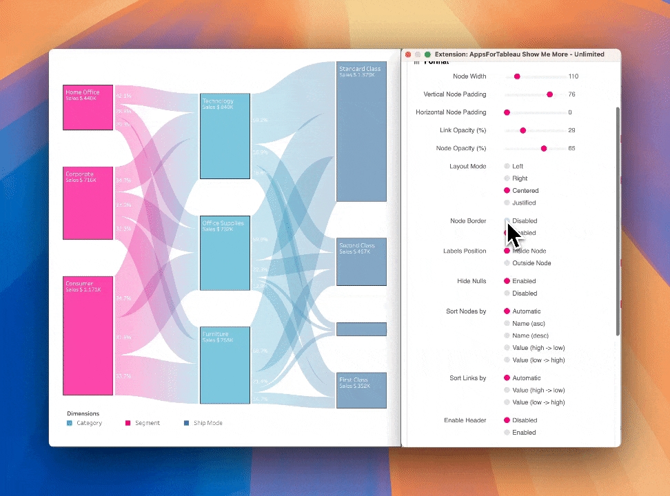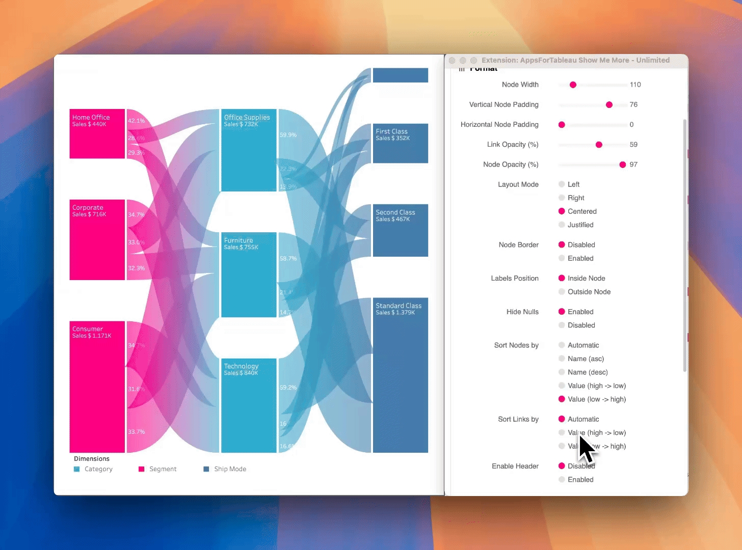 Arrange the order of the nodes by name & value either ascending or descending. Name order can be very useful to have an easy-to-read Sankey Diagram, sorting by value may give you clearer insight into your measures. Automatic will use Sankey Diagram's internal algorithm which calculates the optimal order of nodes with the least link overlaps.