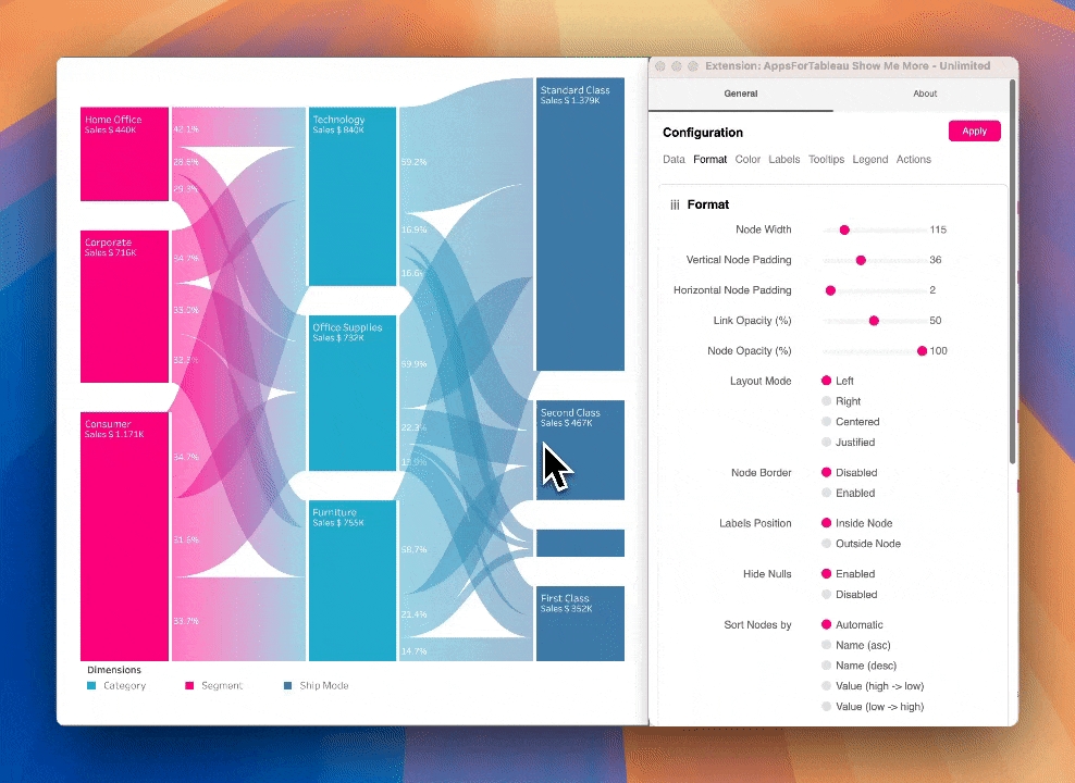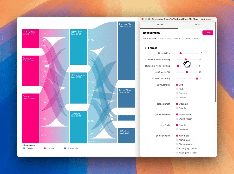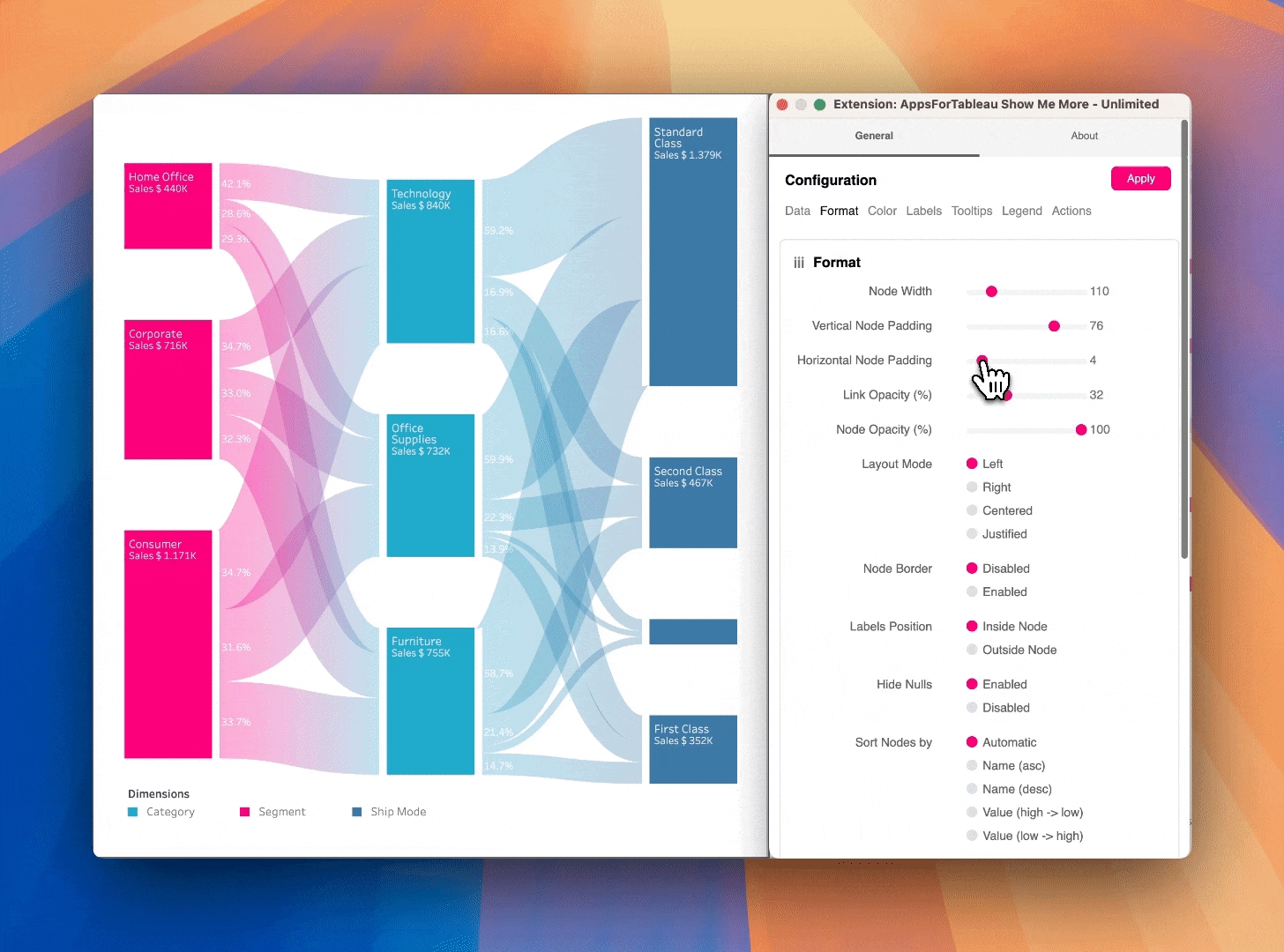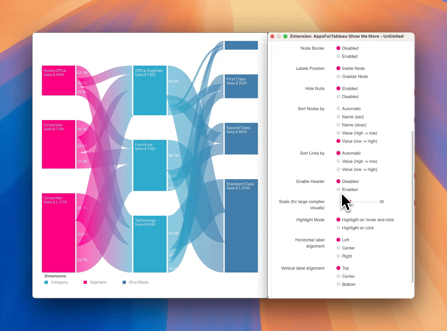 Arrange the order of the nodes by name & value either ascending or descending. Name order can be very useful to have an easy-to-read Sankey Diagram, sorting by value may give you clearer insight into your measures. Automatic will use Sankey Diagram's internal algorithm which calculates the optimal order of nodes with the least link overlaps.