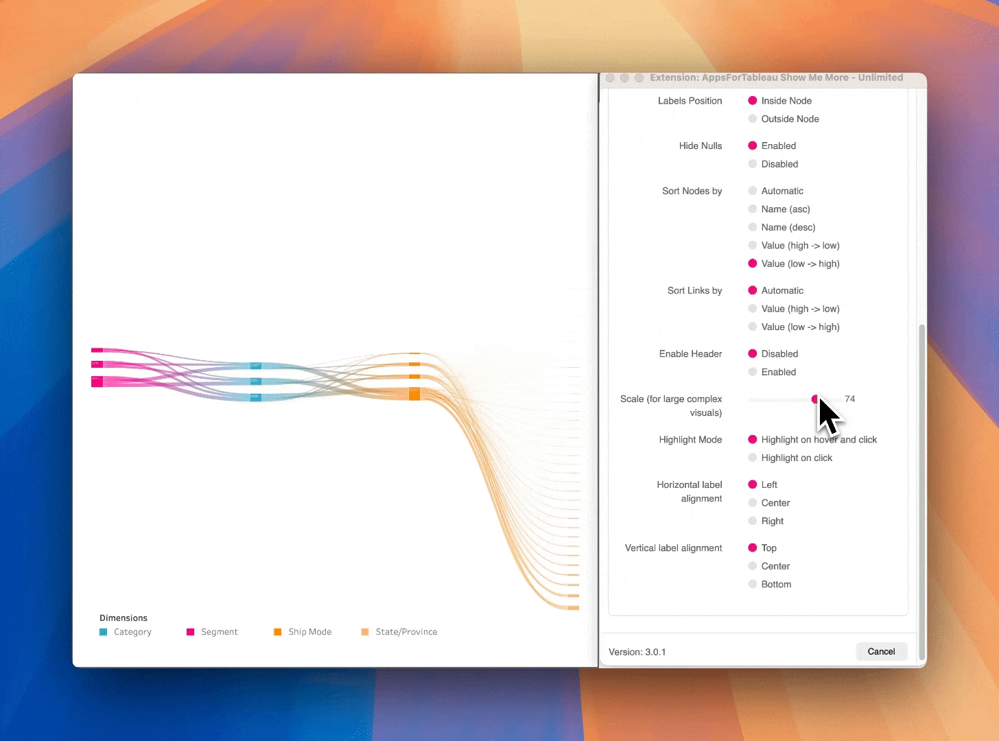 Use the scale scroll bar when you have larger and more complex tables. This will reduce the sizing of all nodes to allow your complex Sankey Diagram to fit to your dashboard.