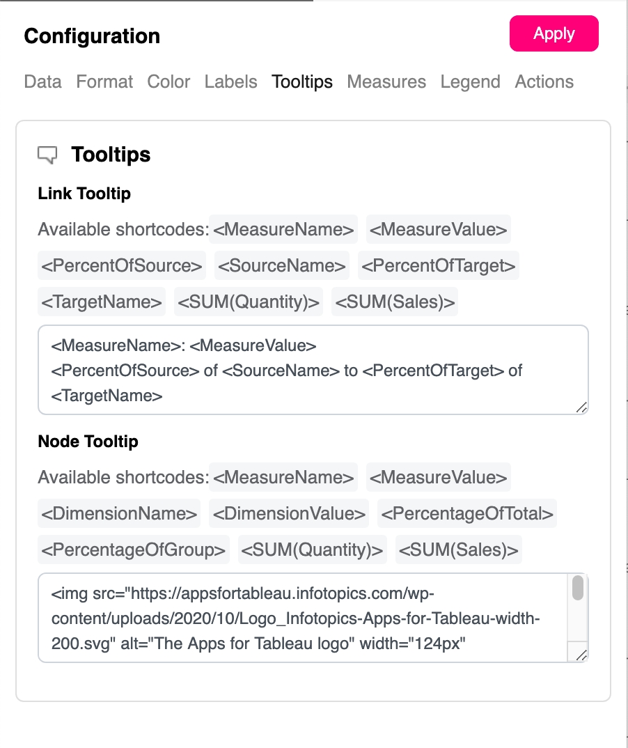 Format your link and node tooltip using short codes and/or free text. You will see the available shortcodes listed. The display in the box shows how they appear in your tooltip. It has the same formatting options as the labels; refer to Labels and Measures for more information.