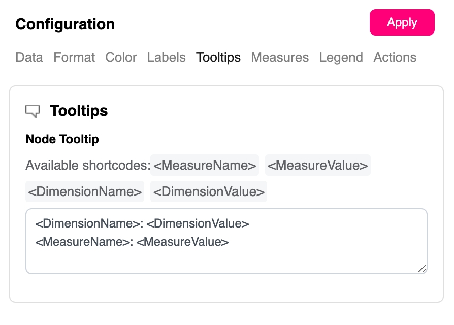 Label Editing Format the content displayed on your nodes, both going to and coming from them. You can include additional text and utilize shortcodes from your data. You can use HTML such as H1, IMG tags, or Bold for additional formatting options. You can put a word in bold and adjust the text size. You can also add more than one measure to labels or tooltips by including them in the data source.