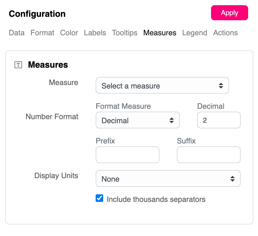 You can format your measure as a decimal or a percentage using the dropdown menu. Input the number of decimal spaces in the 'Decimals' box. You can also add a 'Prefix' and/or a 'Suffix' in the text boxes. The prefix will appear before the word, while the suffix will appear after. For example, a prefix could add a currency symbol like '$' and a suffix could add a percentage symbol '%'. You can also choose to include the thousands separators.