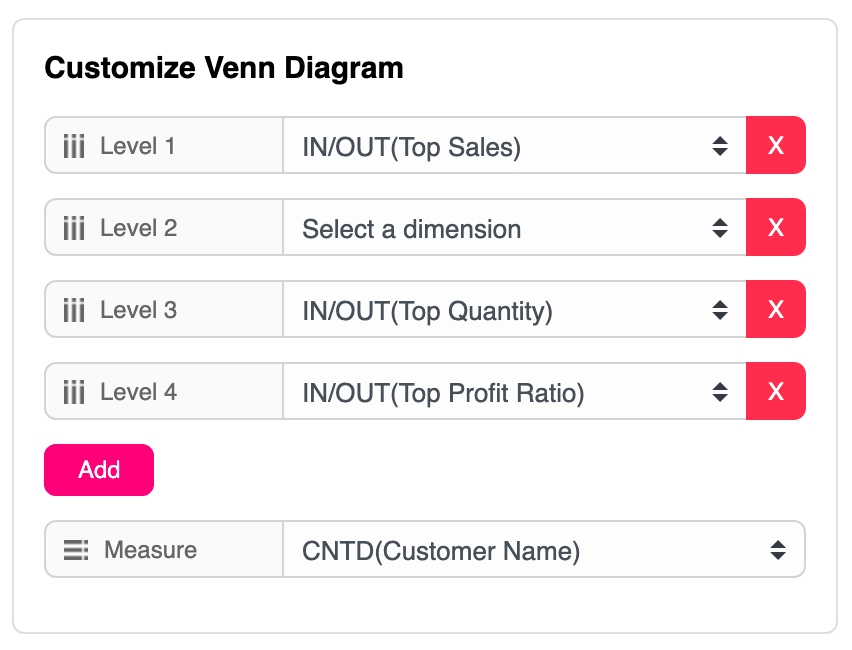 Please select the sets you want to include in your Venn diagram from the dropdown menus provided (such as Top customer's Sales, Top customers Profit, and Top customers Quantity). The chosen sets will be represented by spheres, with size corresponding to the chosen measure (i.e., the number of unique customers). You can use the 'Add' button if you wish to add an extra set to your Venn Diagram.