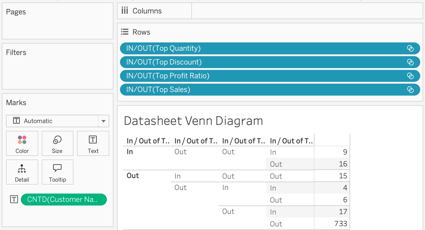 Next, use the sets to create a table which looks similar to identity tables in set theory. Its also fine to drag and drop the sets in detail, however this way its easier to verify data.