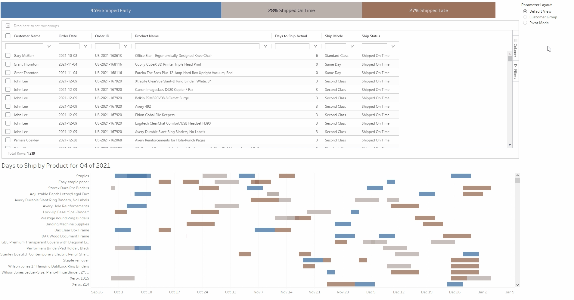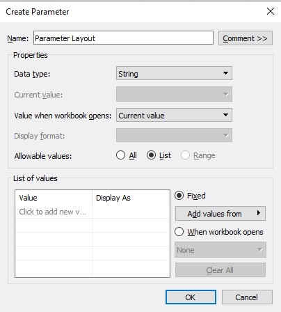 Firstly you will need to create two parameters of type string in your worksheet. One for storing the view and one for the layout change. Leave the value empty.