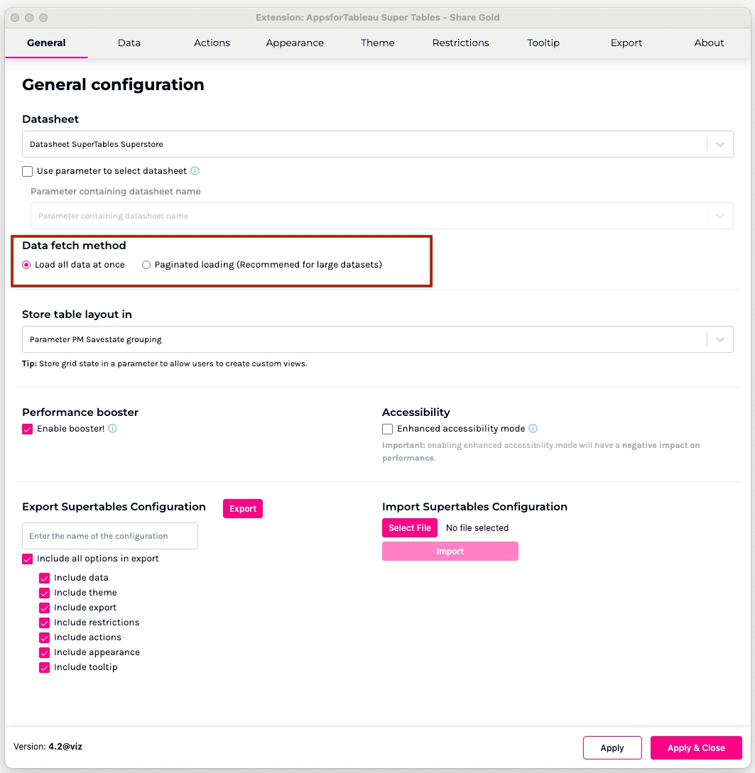 SuperTables offers two ways to fetch your data to the extension, a bulk load all at once or paged loading. The Paged loading option “Loading Screen” requires Tableau version 2024.1 or higher or Tableau Cloud.