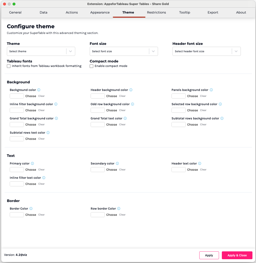 A brand new tab is available for all your theming needs. Open the configuration screen of SuperTables and head to the Theme tab. By default SuperTables will have a Tableau look, you can change the whole style by using our pre-made themes such as Modern and Compact modes in both Light and Dark. Compact mode, as you can imagine, will compact your view, ideal to get all your columns and rows as visible as possible. Why not use one of the set themes as a starting point to then tweak to your liking?