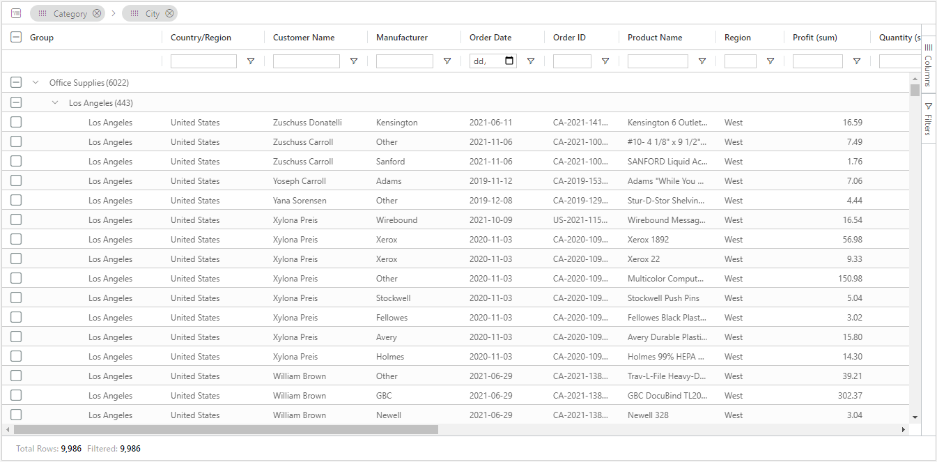 By default, column filters are not applied to cell values shown in Group Rows as they do not usually have any data of their own. However when using Aggregation, group rows will show aggregated values computed based on their child rows. You can filter the grid based on the group row aggregated values by enabling this setting.