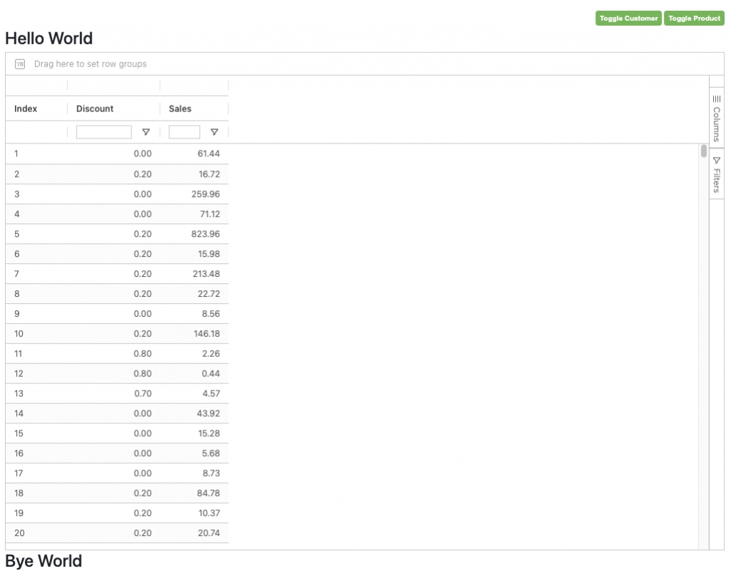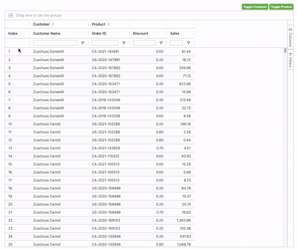We have also added a custom event you can use to hide/show (toggle) columns with a button. This feature enables you to show/hide groups of columns with a single click. There is example code available in custom.js and custom.css for the button layout.