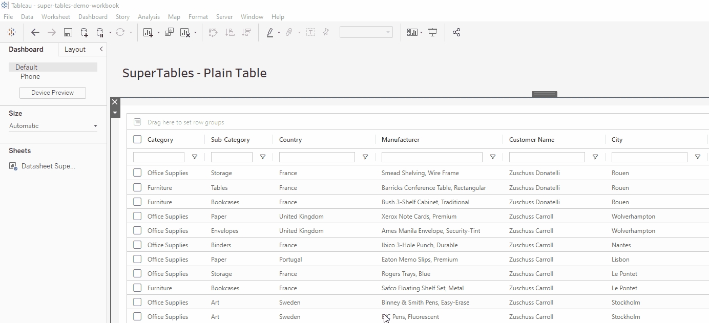 If you wish to export some, but not all rows or cells of your data, you can copy them from your SuperTable into your clipboard for later use in a report or excel environment. Highlight or select the rows or cells which you wish to copy by ticking the checkbox on the far left of your Supertable. Then, right click anywhere (in your selection) and click ‘Copy with headers’. This will save the information to your clipboard for you to paste outside of Tableau in for example your email, a Word report or Excel workbook.