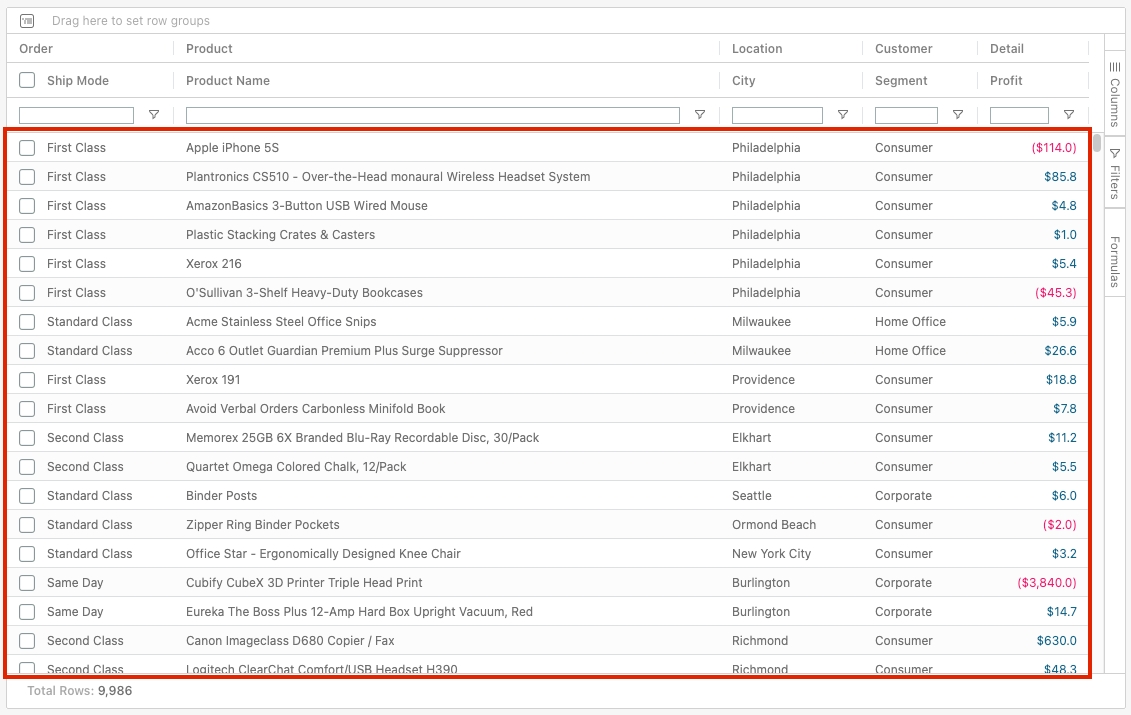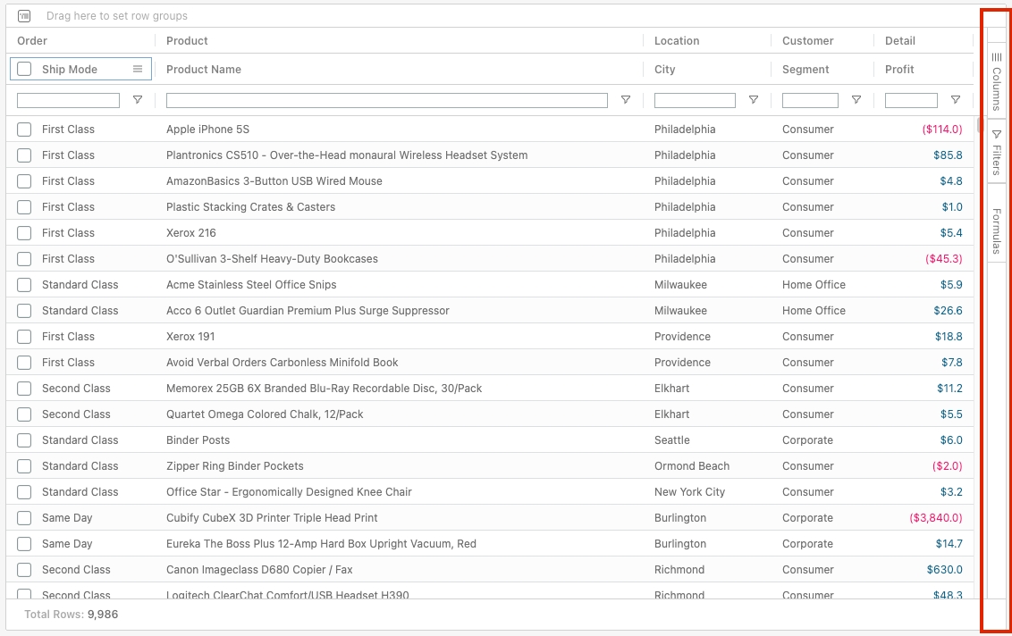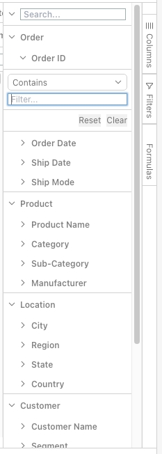 This panel contains all the columns that are available. The check box can be used to display the column in the table.