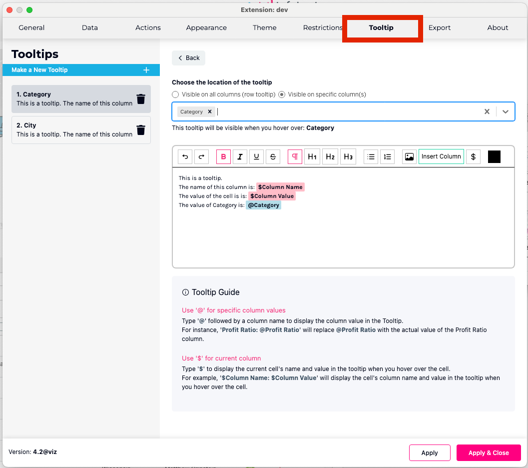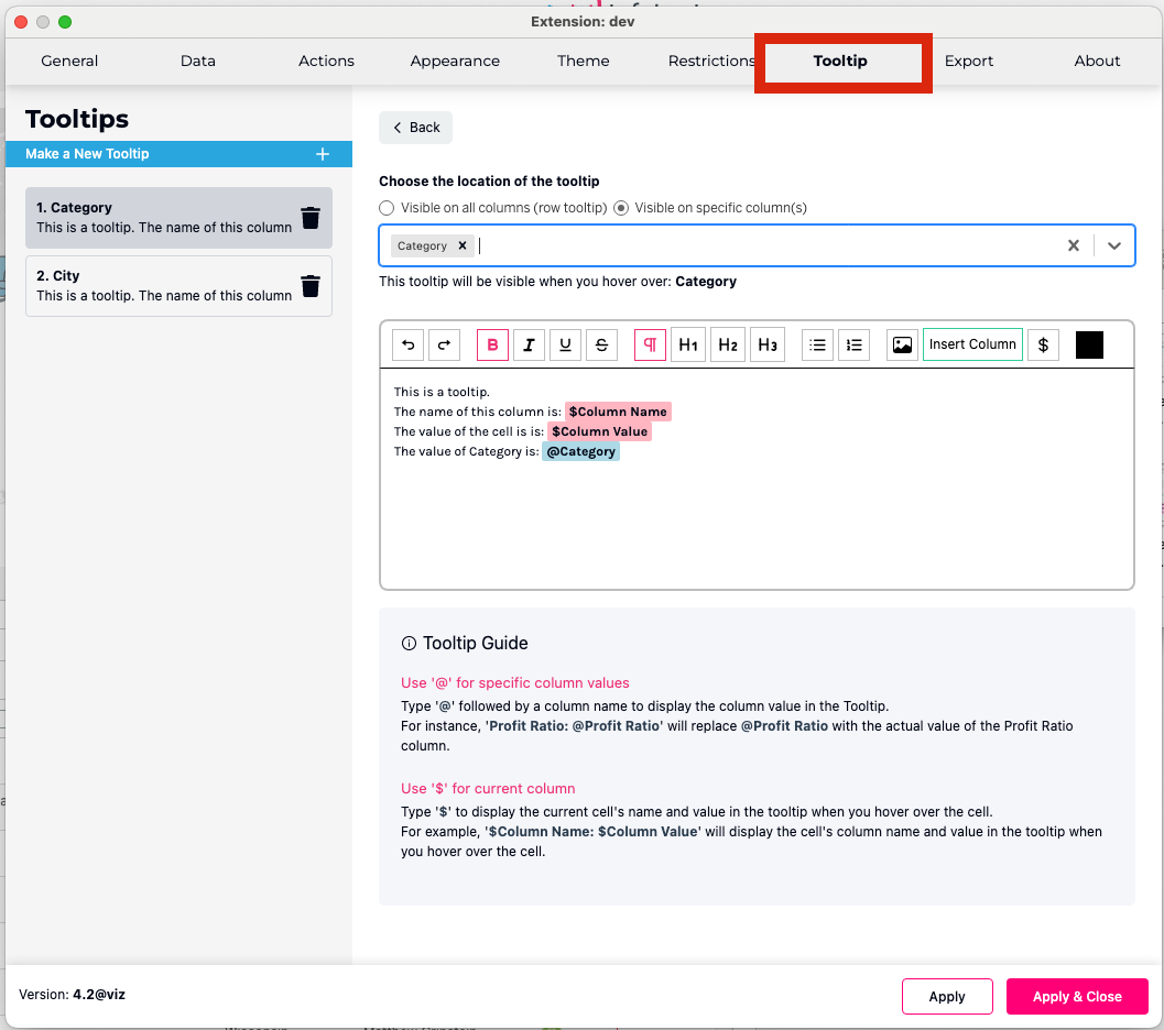 1: Adding a column name or value to your tool tip: Type '$' to display the current cell's name and value in the tooltip when you hover over the cell. For example, '$Column Name: $Column Value' will display the cell's column name and value in the tooltip when you hover over the cell.