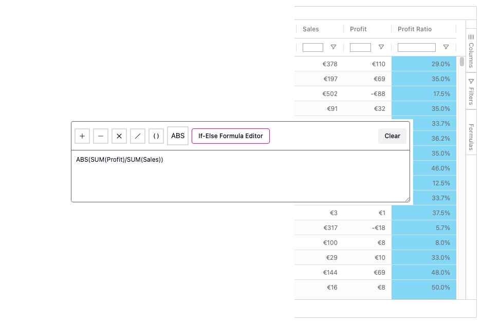 Example of the same calculation with and without ABS, Profit Ratio is the resulting column.