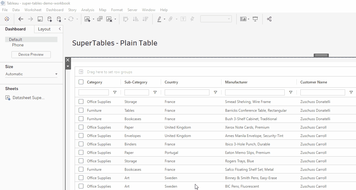 Right click on a cell anywhere in your SuperTable. Under the Export tab you can export all the data to a CSV file, .xlsx or.xml. This will export all the data you are showing in your current SuperTable view. The details of the export can be configured in the “Export” tab of the configuration pane. Export will respect the data type of the field.