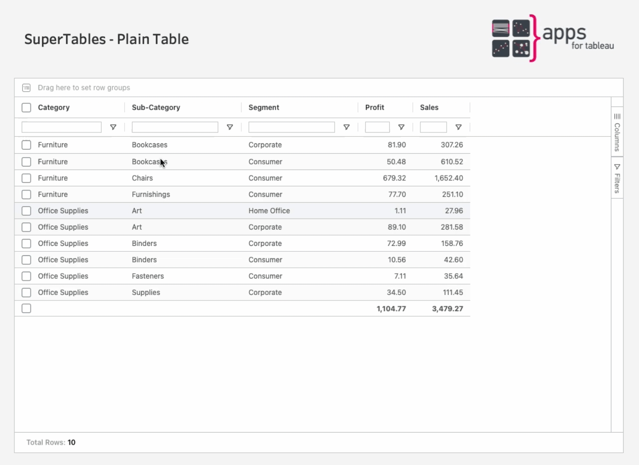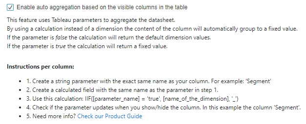 We combine the power of Tableau Parameters and visible columns in SuperTables. By doing this we will automatically remove / add detail from the datasheet which results in a different level of aggregation. With this incredible feature you only query the data you are looking at, and Table Calculations / LOD calculations will also keep working like you expect! On top of that you benefit from a performance boost!