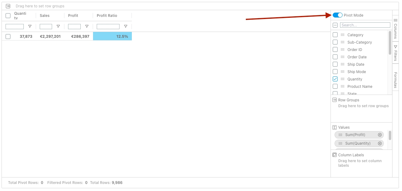 The Pivot Mode can be enabled by opening the side panel and clicking on the Pivot Mode toggle. Your table will now only display the aggregate values of the columns that you had enabled. Try enabling some dimension columns. Enabling the columns will the dynamically aggregate the data based on the data in the column.