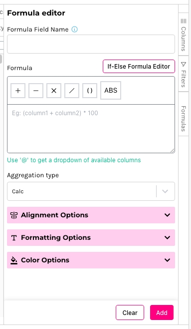 This panel contains all the columns that are available. The check box can be used to display the column in the table.