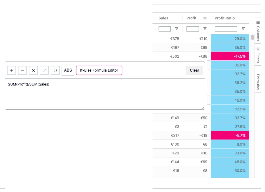 Example of the same calculation with and without ABS, Profit Ratio is the resulting column.