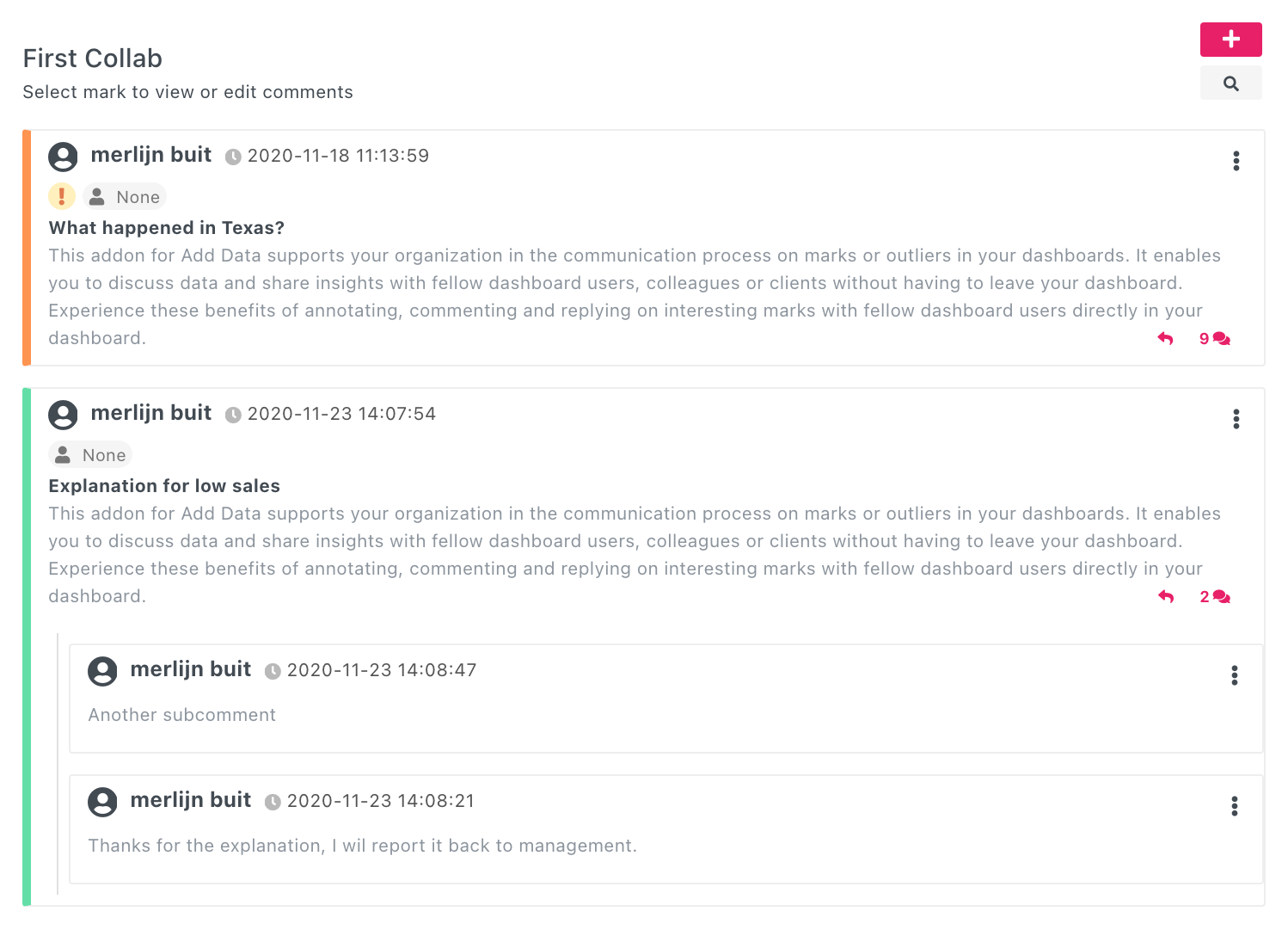 📝 Description: This is an addon for Add Data, not a separate module. It lets users exchange comments, reply to feedback, and annotate insights without leaving Tableau.