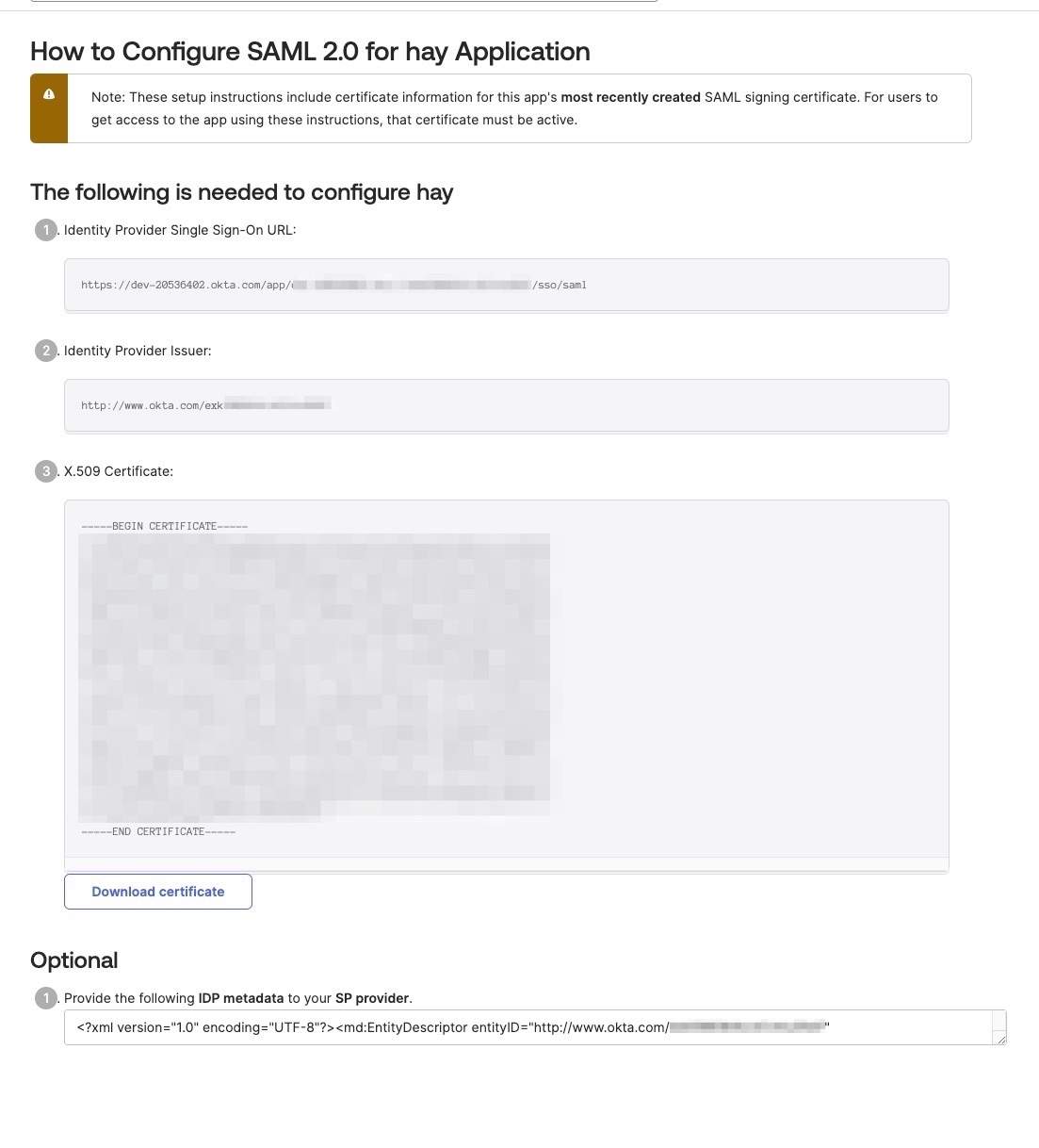 On this page you can find your Idp Identifier, login url and certificate.