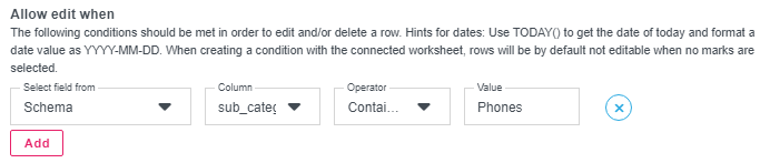The Allow add when feature behaves slightly differently in a data correction schema. Any rule added to Allow add when only controls the + button at the top and does not affect the ability to select a mark that doesn’t yet exist in the schema. If you also want to restrict record creation when selecting such a mark, you need to add a corresponding rule under Allow edit when.