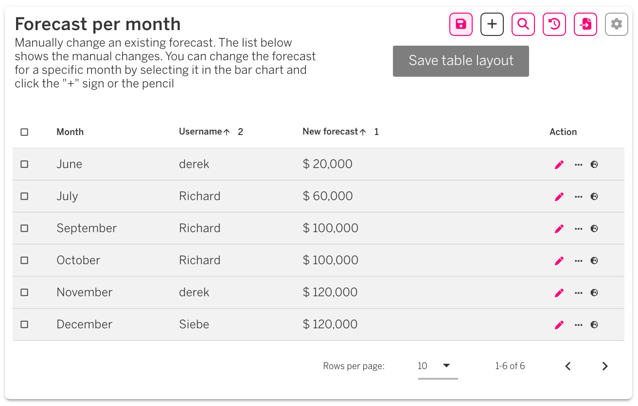 On the overview page we allow saving the table layout which includes the Rows per page setting at the bottom and the sorting of the table. This is only available for the dashboard designer. Viewers will see this exact table state when they open the dashboard.