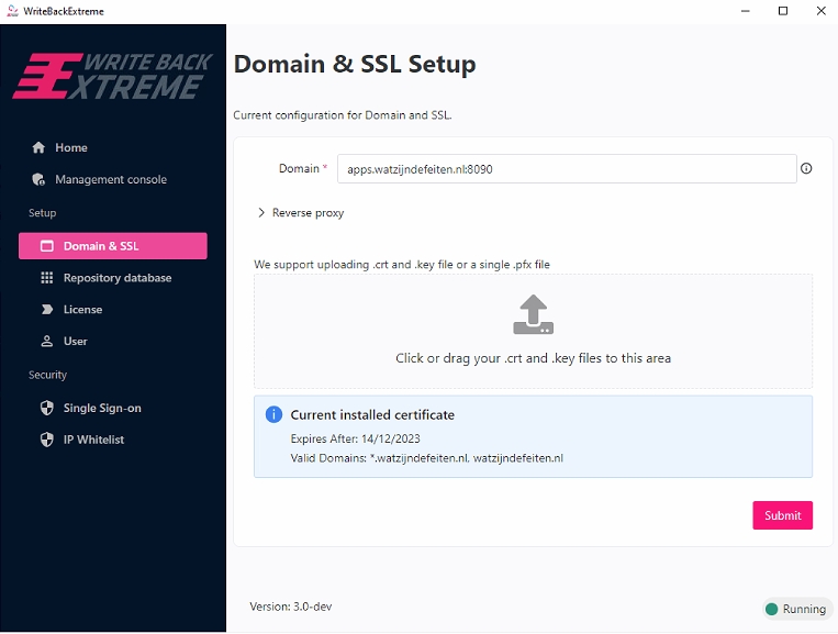 On this page it is possible to (re)configure the domain, proxy and SSL certificates for the WriteBackExtreme service.