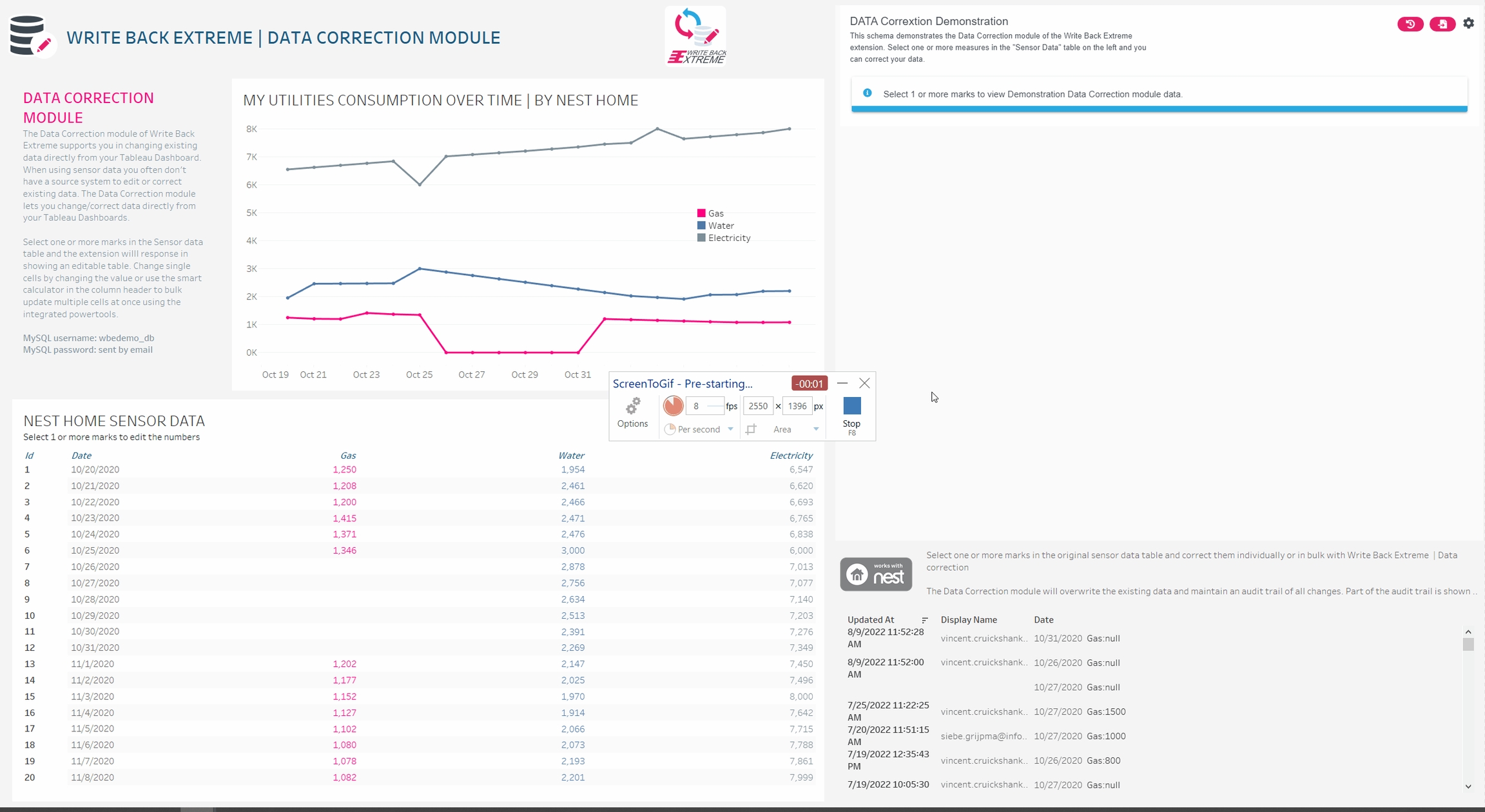 Display an inline editable table with powerful tools like bulk-edit, interpolation and much more. Use selections in your Tableau Dashboard to filter the data you want to correct, change, add or remove. You can use Data Corrections for a lot of use cases like correcting wrong or missing sensor data, typo corrections in a dimension and other data quality related challenges.