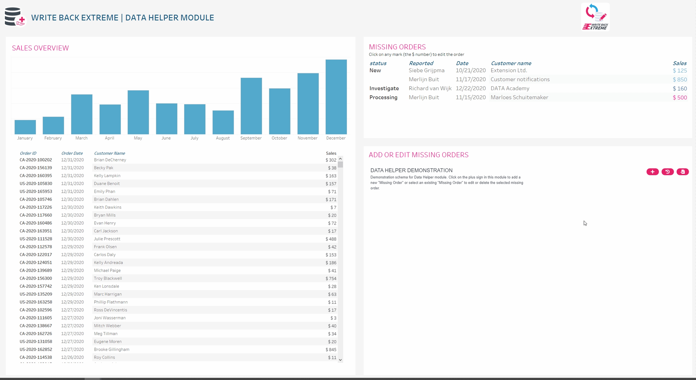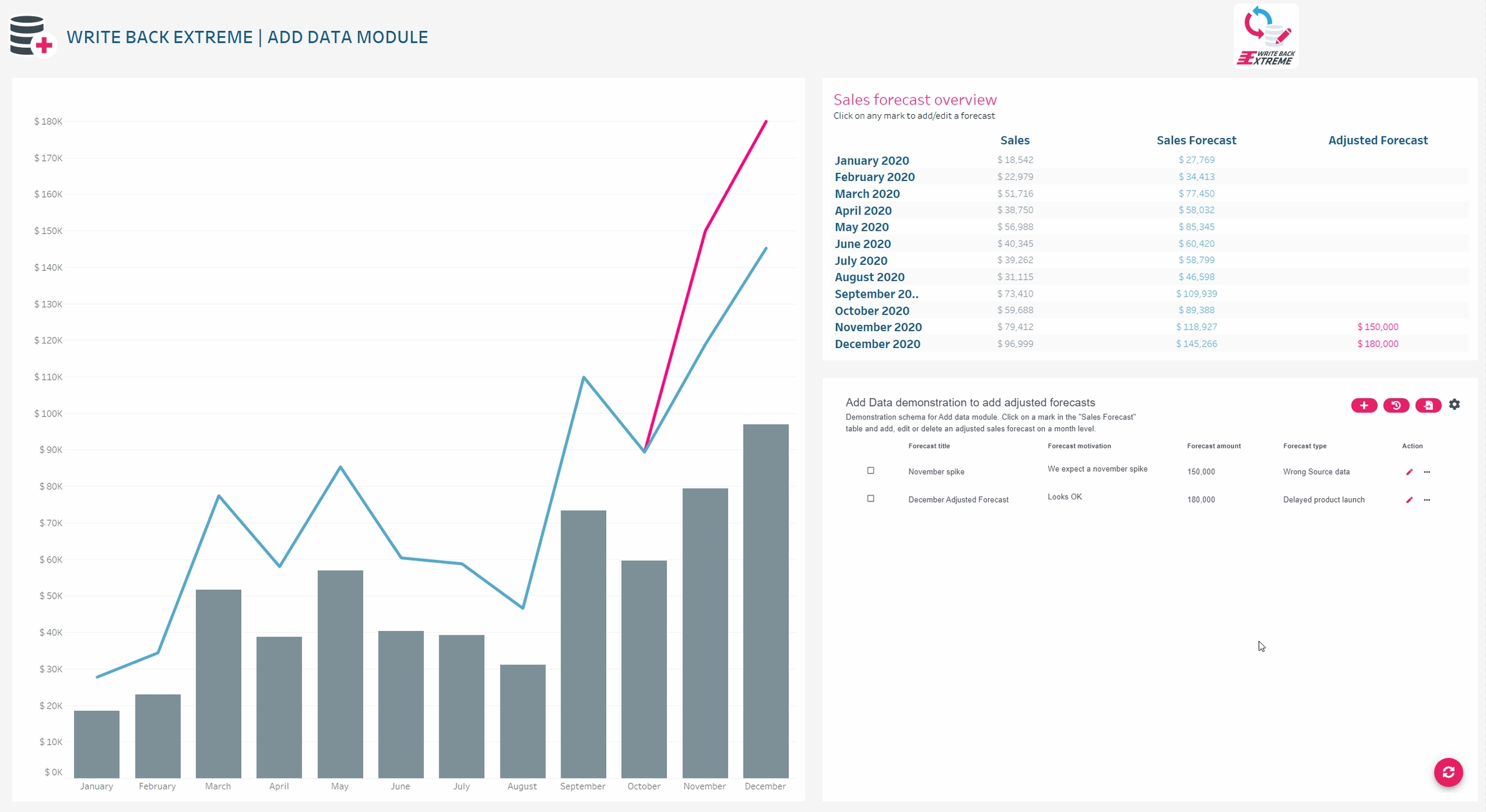 Add data to visuals on a summary data level. Create dynamic forms to enable unlimited possibilities. You can use the Add Data module for example to add targets on a month level while the underlying data exists of millions of rows. The Add Data module works great with the new Tableau Relationships. Of course you can also use blending and joining to display the Added data in your Tableau Dashboards.