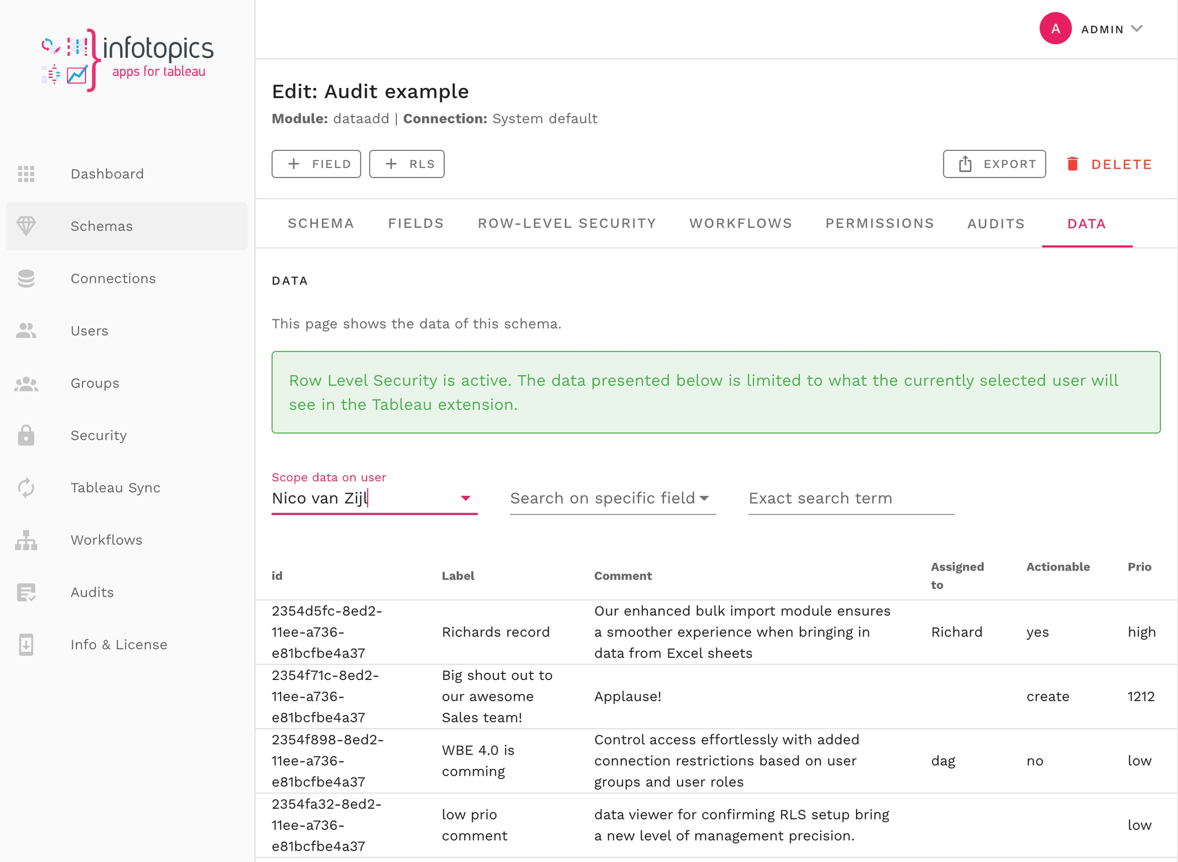 Review the data stored in a schema using the data-tab. This not only allows for investigation of the available data but improves control of Row Level Security measures. Impersonate a user and see what data is available to them.