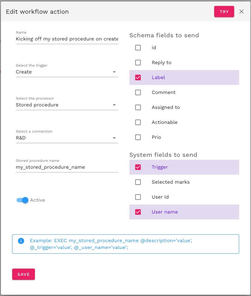 Tutorial (video)On the bottom you can find the actual statement that will be executed on the database when the workflow is triggered. The Try now button on the top right will execute this statement directly to test the execution.