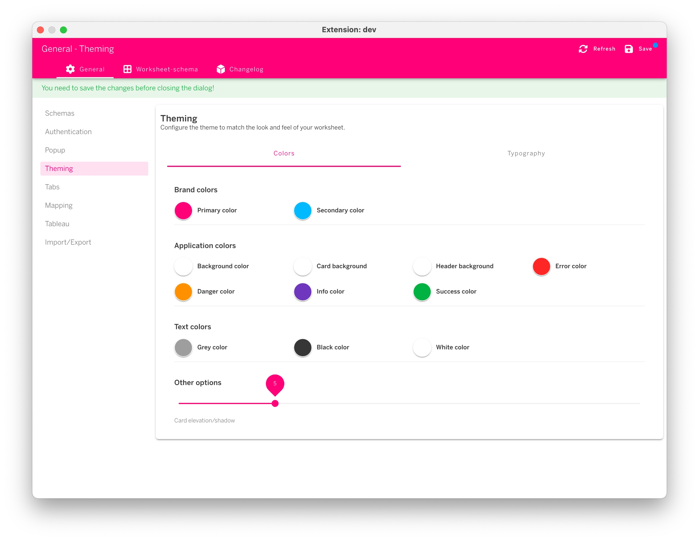 Match your dashboards style using Theming. We understand the importance to match your companies branding to keep your dashboards looking great. Change the colors of the whole brand along with text and system colors. Use the typography tab to change the font style and size.