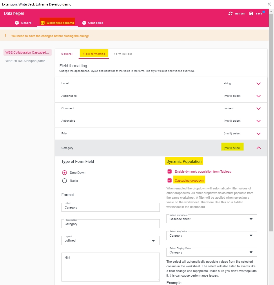 Open the configuration of the extension to link to the sheet that holds the cascading information and choose the category.