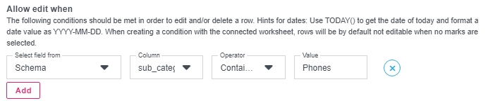 The Allow add when feature behaves slightly differently in a data correction schema. Any rule added to Allow add when only controls the + button at the top and does not affect the ability to select a mark that doesn’t yet exist in the schema. If you also want to restrict record creation when selecting such a mark, you need to add a corresponding rule under Allow edit when.