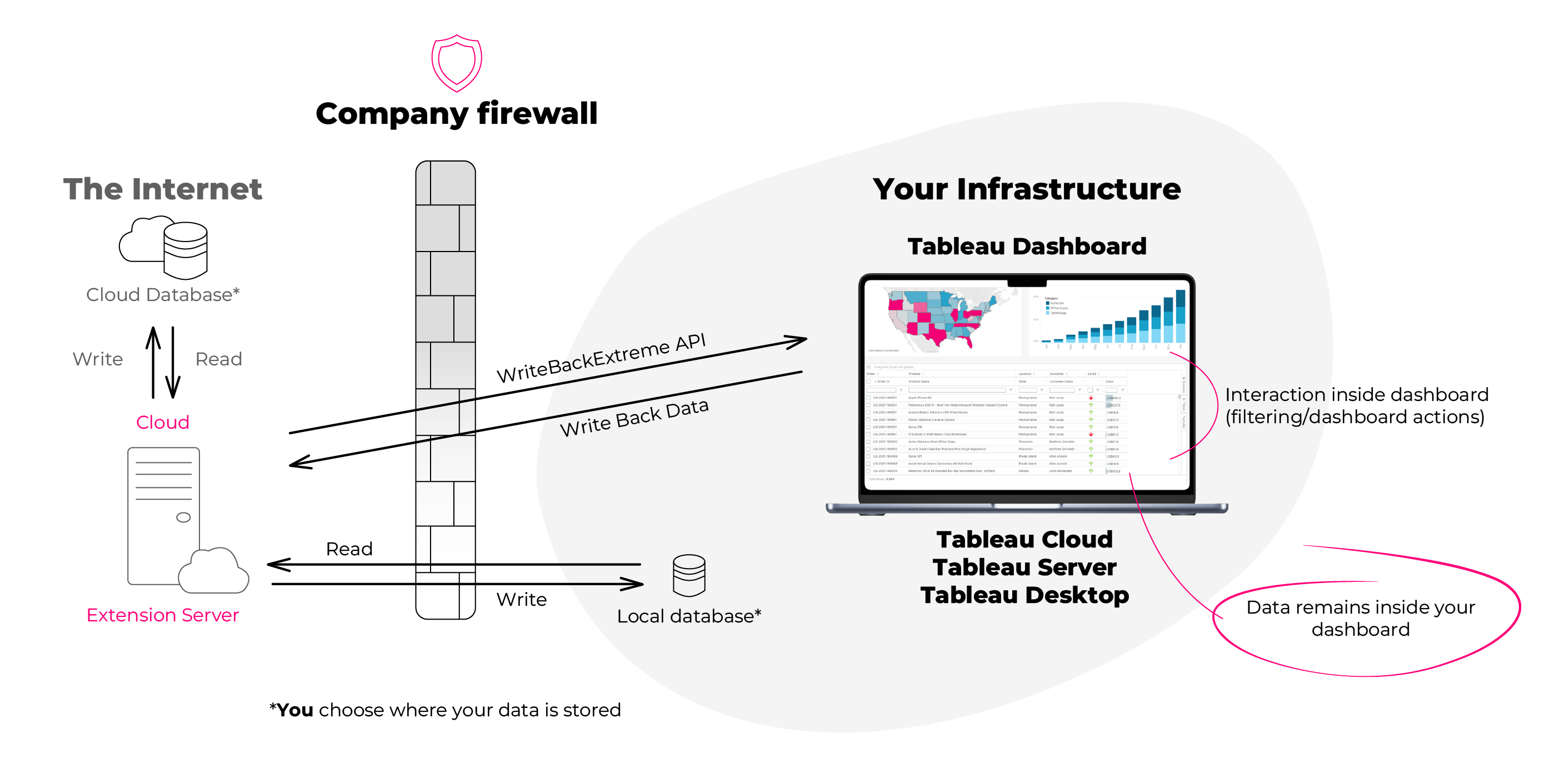 Write-back data is stored in the databases that already exist in your own infrastructure—the same data sources commonly used in your Tableau environment. When you create DATA Helper or ADD Data schemas, the extension automatically creates the required tables in your selected database. Any changes you make to the schema in the Management Console will also update the corresponding tables. Because this process is fully automated, we strongly recommend **not** modifying these tables manually, and instead to do all changes through the Management console of the extension.