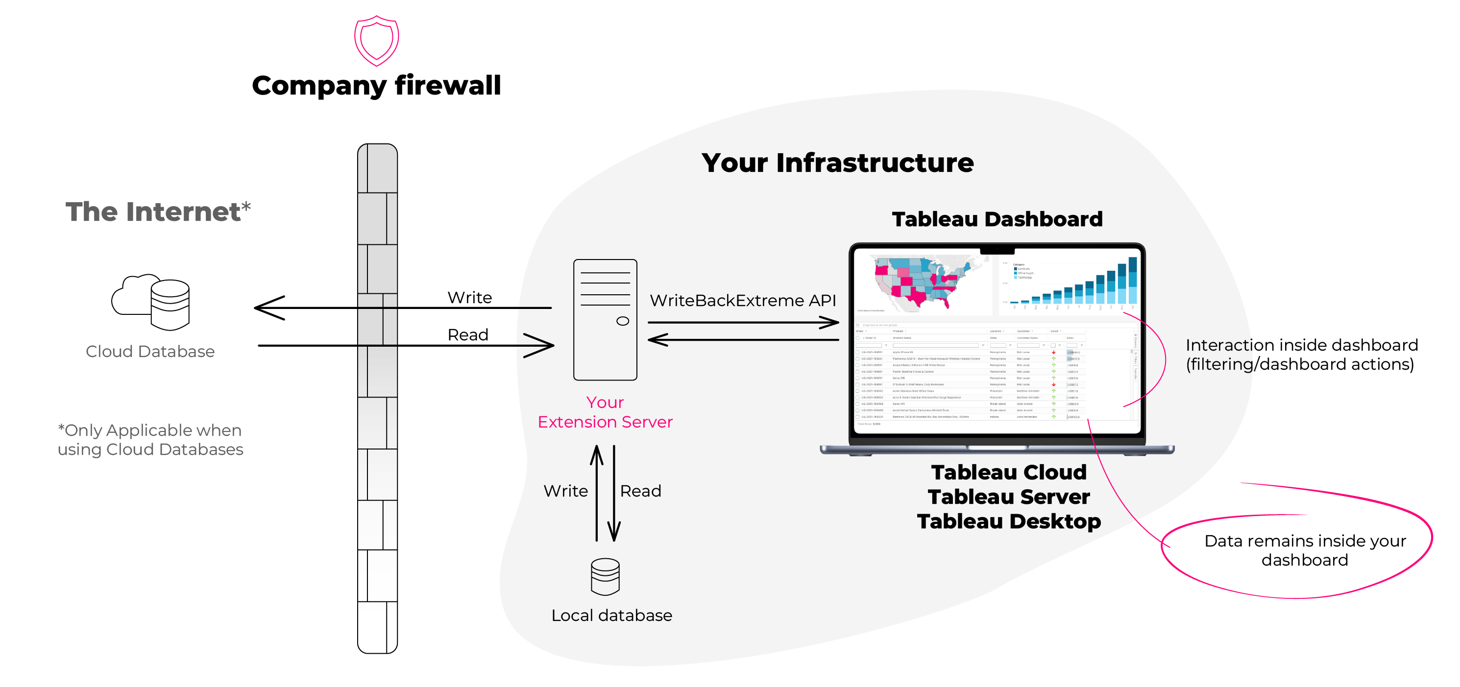 When the dashboard loads the extension, Tableau connects to the WriteBackExtreme Extension Server. This server provides the required JavaScript, HTML and CSS so the extension can render inside the dashboard. All rendering happens on the **client side** (Tableau Desktop or browser).\