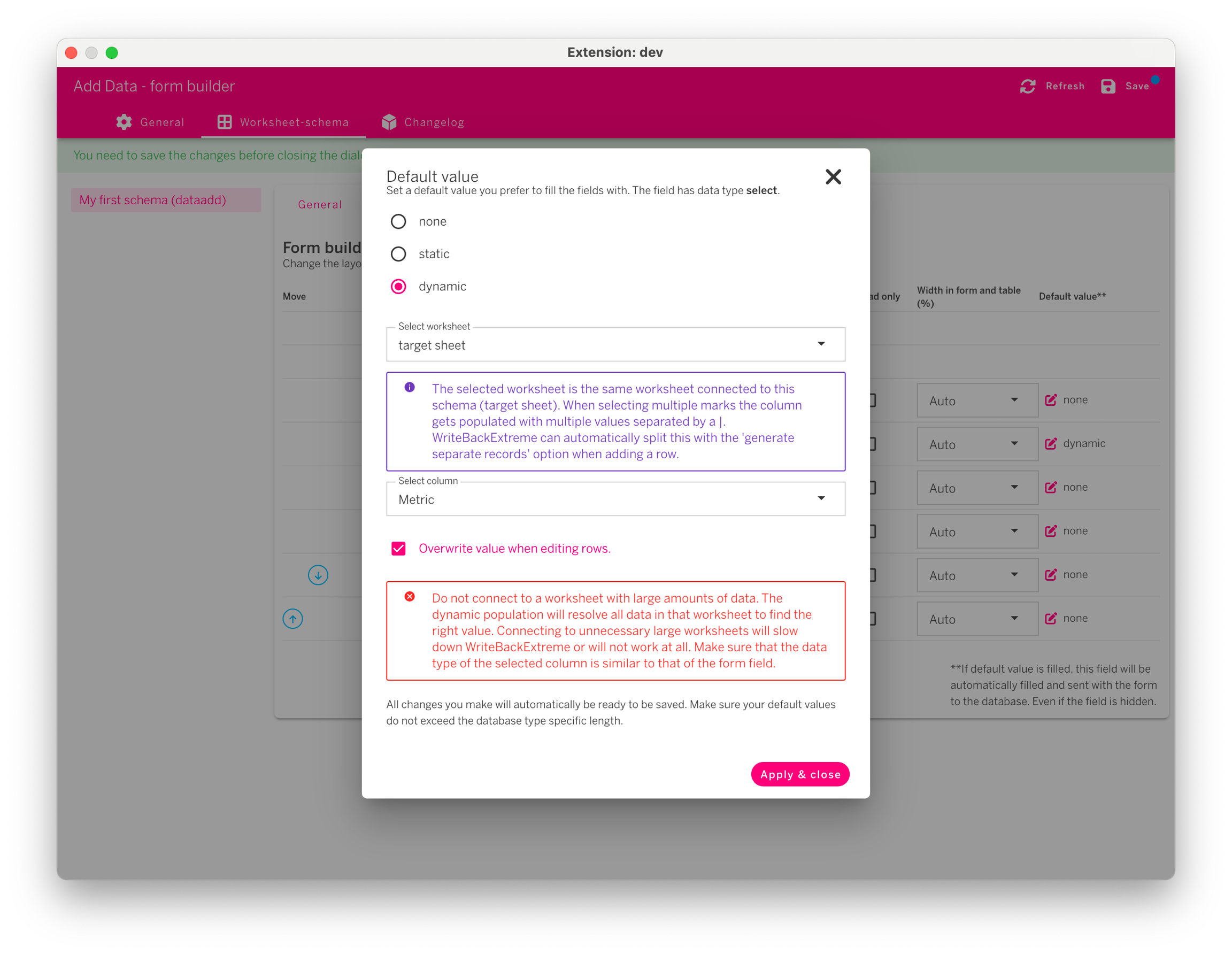 Under ‘Default value’ header is where you will be able to make your values dynamic. Simply click underneath the Default value header on the schema(s) you wish to change to have dynamic values. You will be presented with a pop up window where you can choose between none, static & dynamic values. When choosing dynamic simply choose your desired worksheet and column within that worksheet. NOTE: Make sure that the data type of the selected column is similar to that of the form field. See it in action here: Dynamic values