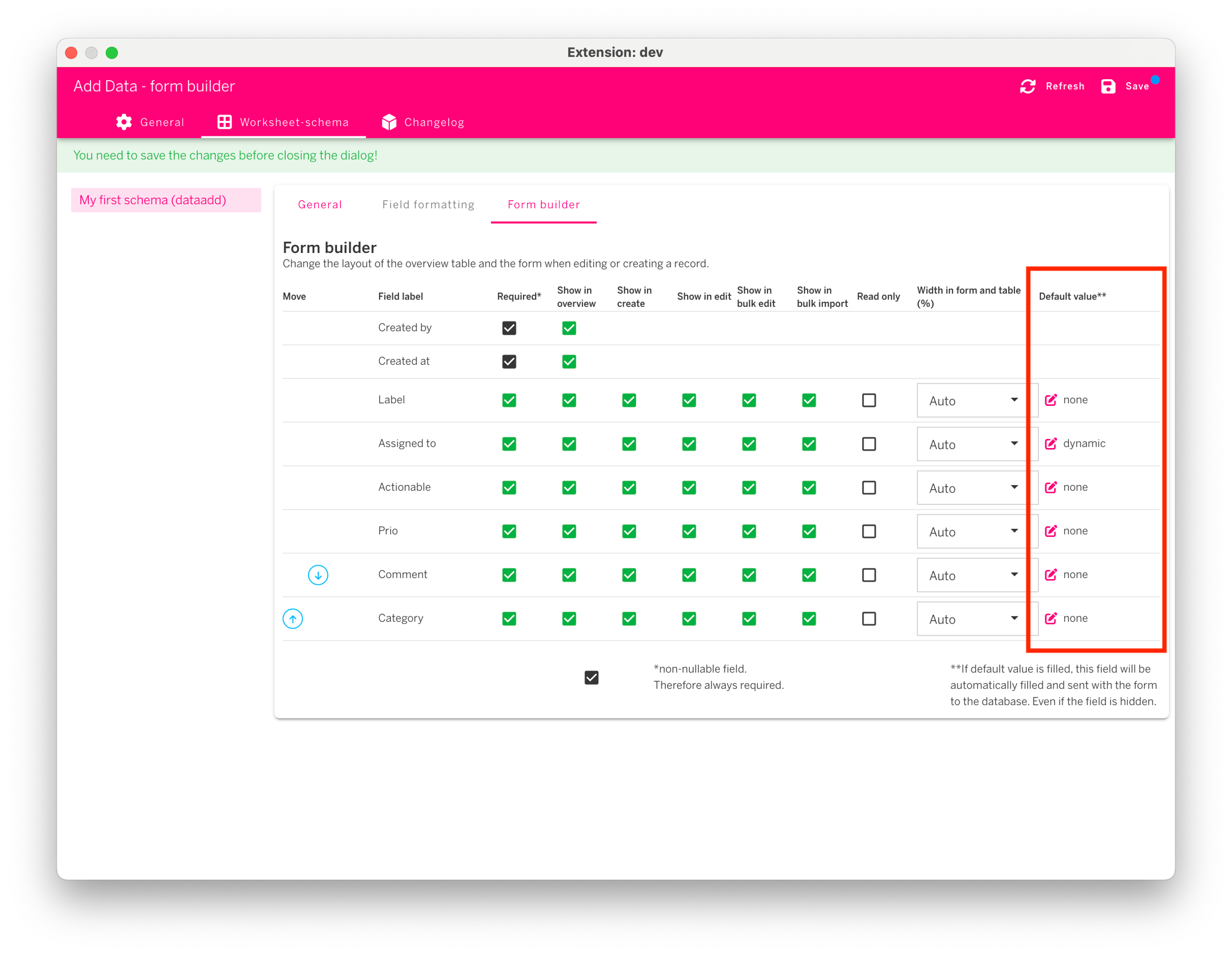 Use values that are present in your dashboard and store them in fields of your form. This feature hugely improves your flexibility and control. In this way, you can also gather information on dimensions and measures from your dashboard without user input! To add have this powerful feature, open up the configuration screen within your extension. Click on the Worksheet-schema tab where the list of your schemas will be shown, click on desired schema and open the Form builder tab.