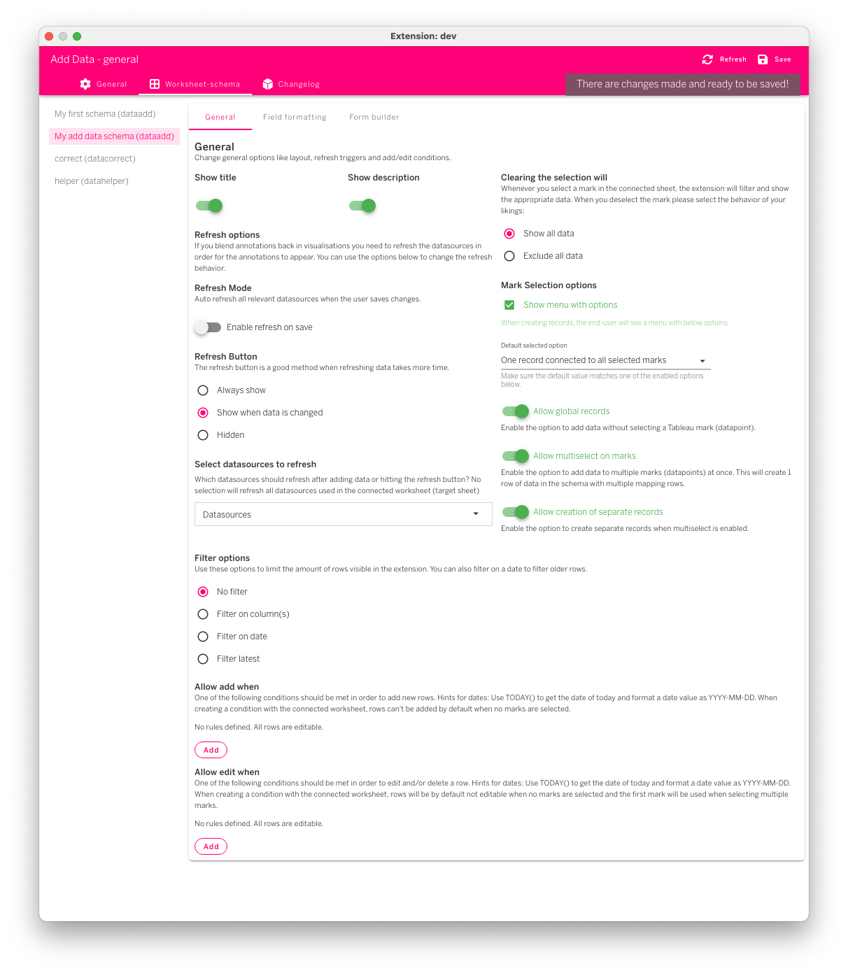 When saving any changes within your form, the extension will automatically refresh when enabling. It’s also possible to show the refresh button within the extension, this will help when refreshing the data takes more time. Note: These features only work if the data helper sheet is connected with a worksheet!